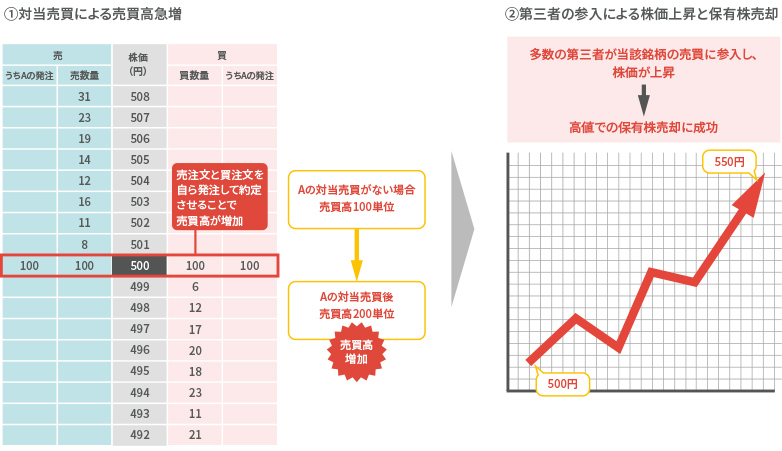 ②Aの対当売買による売買高の増加を見て、売買が活発に行われていると誤解した多数の第三者が当該銘柄の売買に参入し、株価が上昇したところで、より高い値段(550円)での保有株売却に成功。