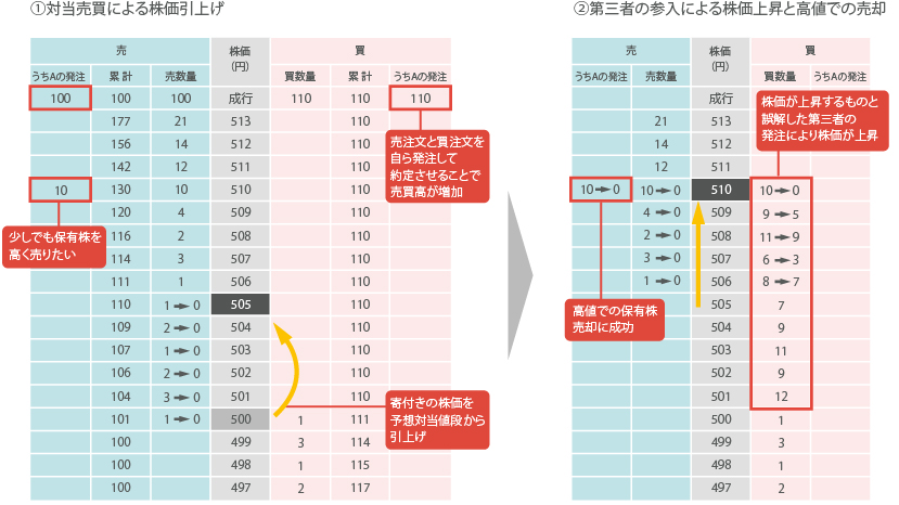 POINT=当法人では意図的に自らの売注文と買注文を対当させることで、株価を変動させるような行為について、不公正取引に繋がるおそれのある取引として注視しています。