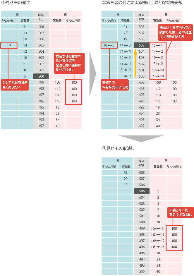 「見せ玉」とは、他の投資者に相場が自然に形成されたと誤解させて売買取引に誘い込むことを目的として、約定させる意思のない買付け注文又は売付け注文を行うことです。
