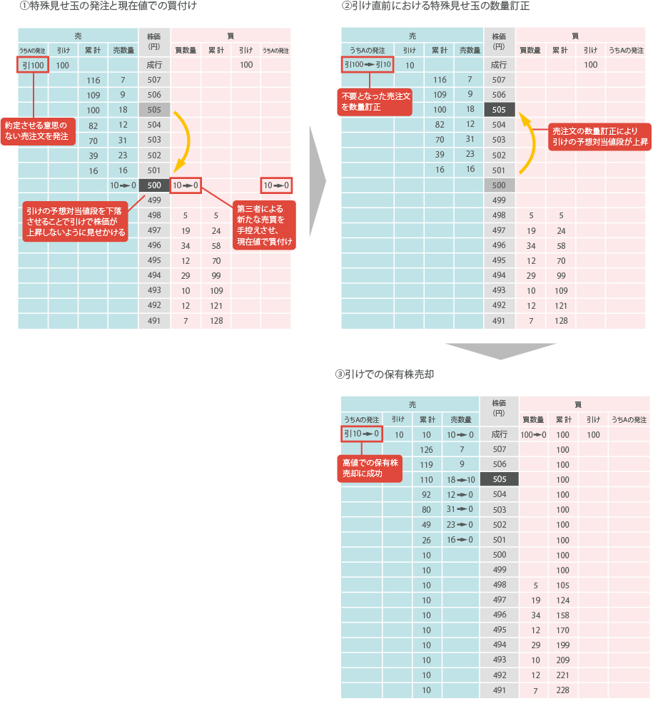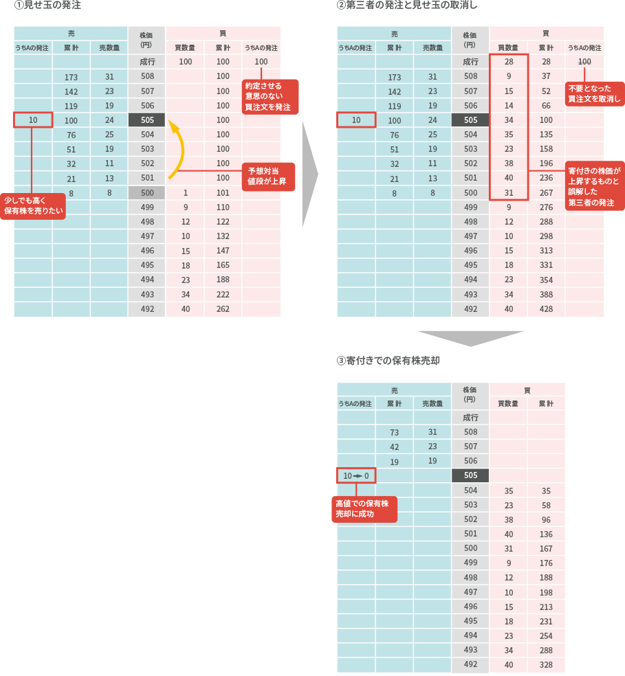 ①寄付き前に「約定させる意思のない成行買注文(見せ玉)」を100単位発注することで、予想対当値段を505円に引き上げる。併せて元の予想対当値段より5円高い505円に10単位の売注文を発注。