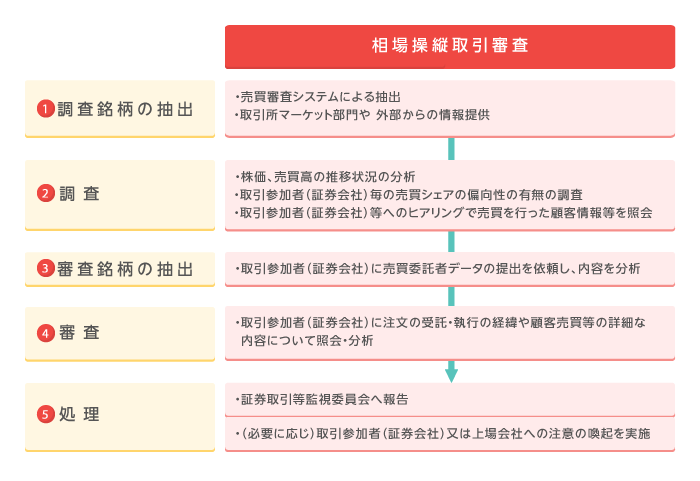 したがって、こうした買付けが行われた場合には、発注・執行形態について問題性の検証を行うほか、証券会社を通じて、こうした注文を発注した者に価格を操作する事情があるかどうかについても確認しています。